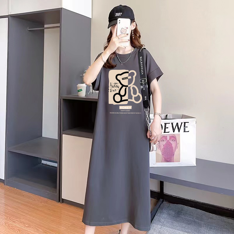 4分鐘前慵懒风短袖t恤裙女夏季休闲宽松过膝长裙纯棉长款连衣裙大码女装 - 灰色套裝