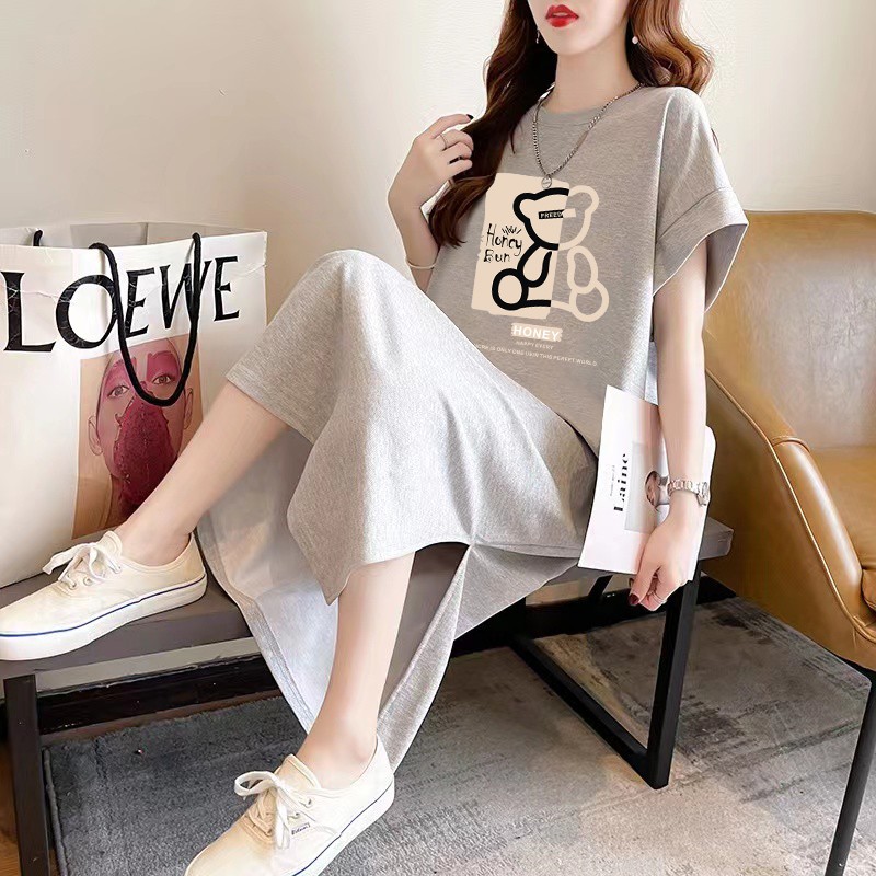 20分鐘前慵懒风短袖t恤裙女夏季休闲宽松过膝长裙纯棉长款连衣裙大码女装 - 灰色套裝